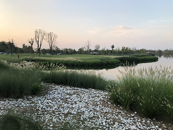 本次調研,海綿城市技術中心對園區植物搭配、水系設計、功能小品、生態駁岸、空間營造等造園手法進行學習,重點學習園區內透水鋪裝、礫石排水溝、梯級雨水調蓄凈化設施、下凹式綠地、生態樹池等海綿城市典型設施建設手法。