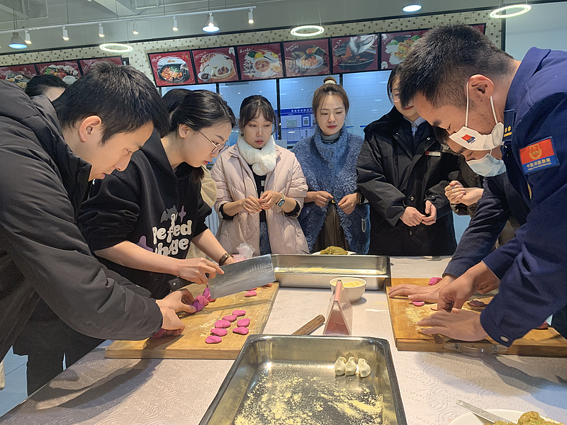 活動首先通過暖場小游戲將參與人員分為三組,根據菠菜、火龍果等不同顏色、不同口味的面團,設置“鴻運當頭”“不忘初心”“翡翠玲瓏”的組名,餐廳工作人員為大家演示包餃子的正確手法。
