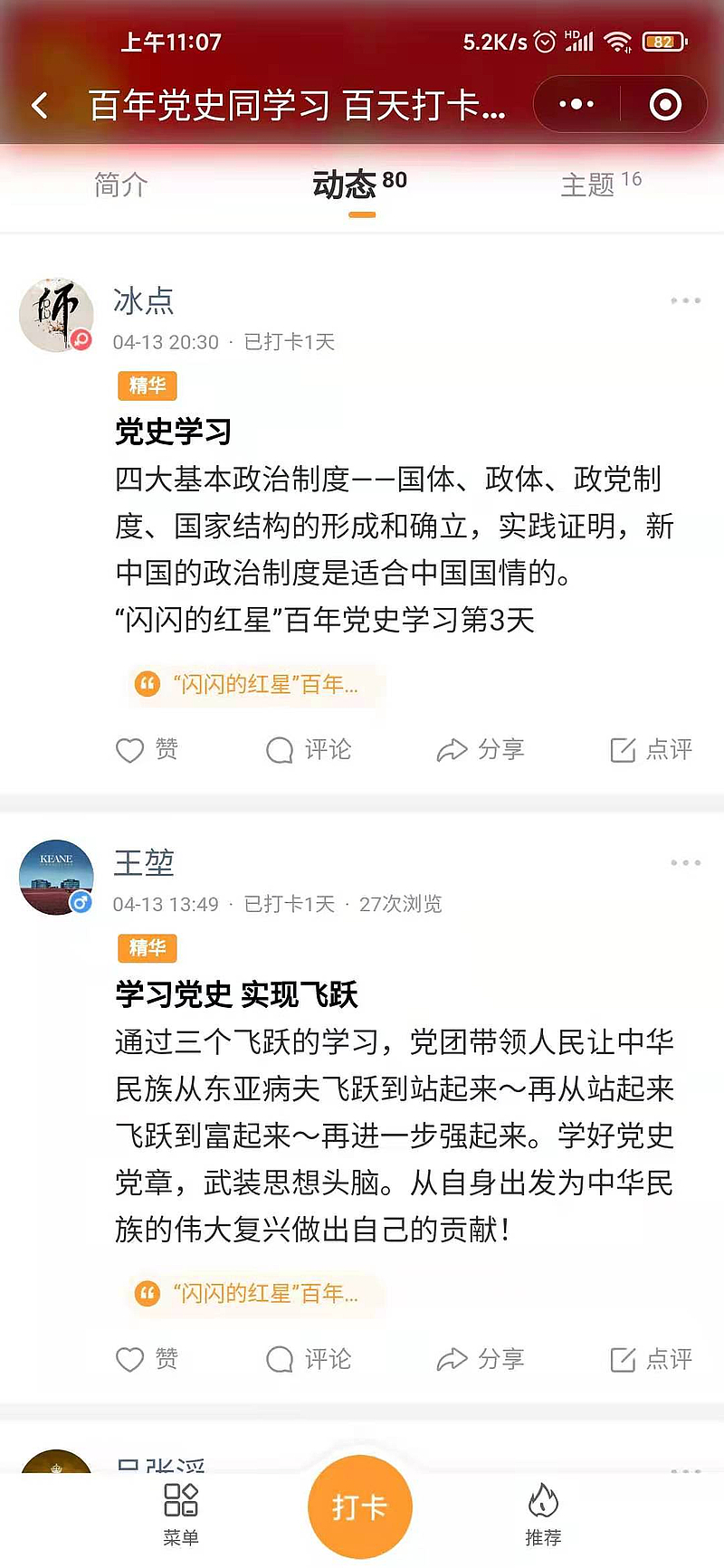 為慶祝中國共產黨成立100周年,創新黨史學習教育形式,營造濃厚黨史學習教育氛圍,近日,灃西集團投資公司黨支部閃閃的紅星“百年黨史同學習 百天打卡共進步”活動正式啟動。活動圍繞“344”模式,即結合“黨史學習、學習心得分享、積分打卡PK”3大板塊,通過“讀、聽、學、悟”4種學習方式,滿足黨員“隨時學、隨地學、自主學、互動學”4種學習需求,實現黨建經營雙促進的總目標。