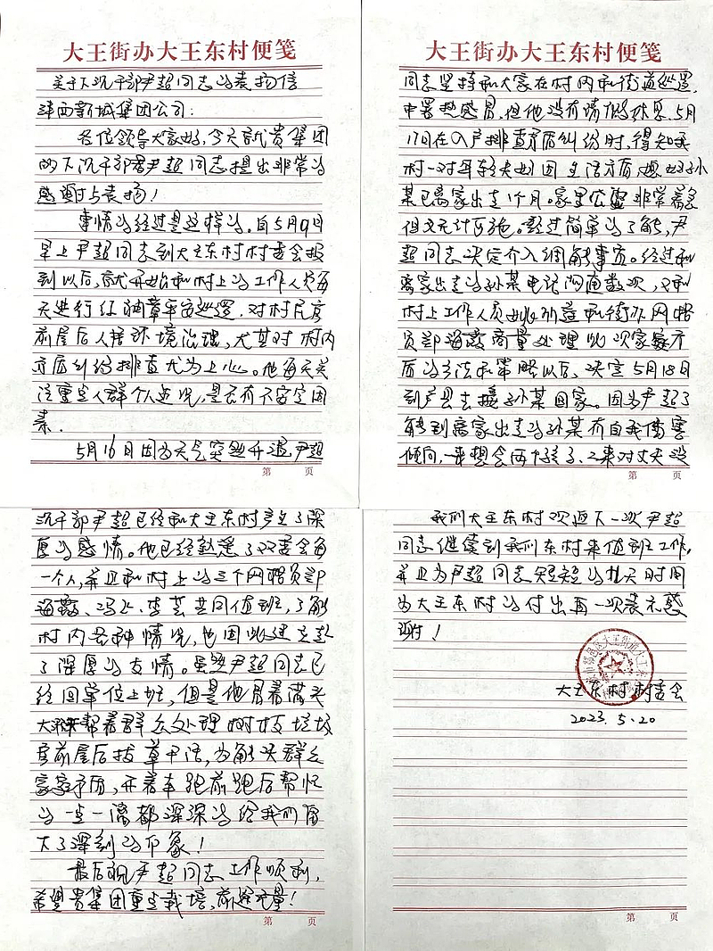 “歡迎房建項(xiàng)目部尹超同志下一次繼續(xù)到我們大王東村來(lái)值班工作”——這是一封來(lái)自大王東村村委會(huì)的表?yè)P(yáng)信。今天,讓我們一起聽(tīng)聽(tīng)房建項(xiàng)目部尹超下村那些事兒。