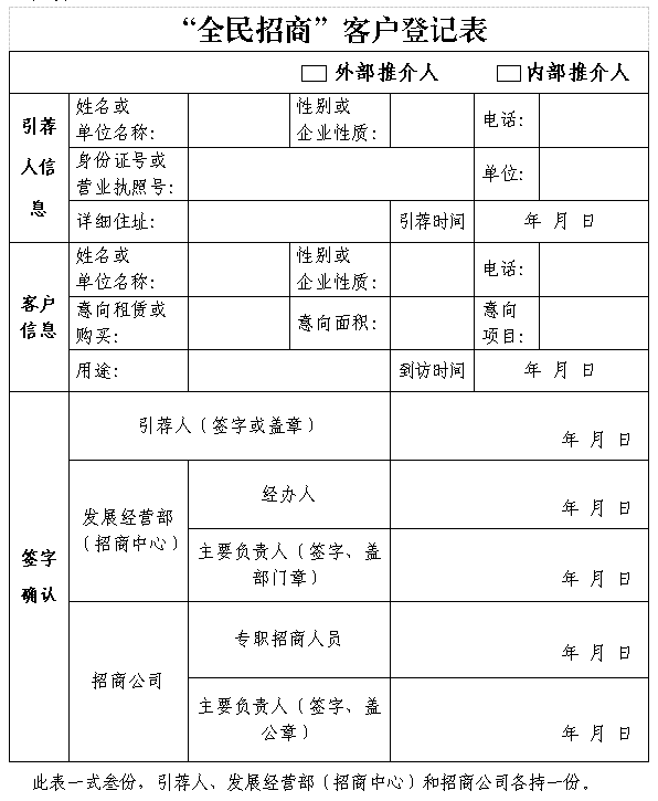 (二)引薦人需將客戶信息報至發(fā)展經(jīng)營部(招商中心),并持有效身份證件填寫《“全民招商”客戶登記表》(詳見附件),發(fā)展經(jīng)營部(招商中心)需在《“全民招商”客戶登記表》簽字蓋章確認(rèn)引薦信息,并根據(jù)項目招商代理情況,安排招商公司接待客戶。未進行登記的,不得認(rèn)定為引薦人。