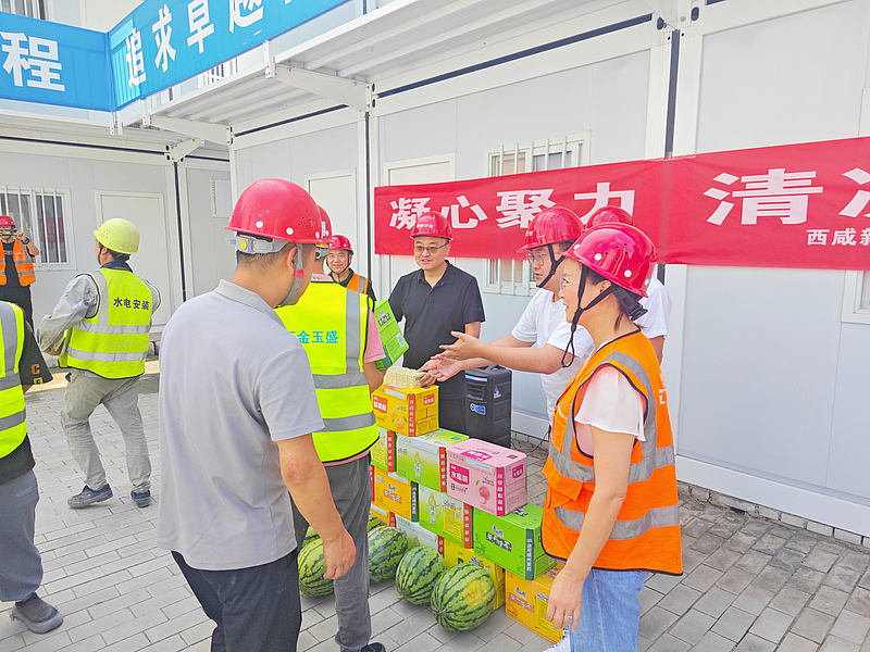 高溫季節來臨,堅守在建設一線的管理及施工人員仍在熱火朝天抓生產,為了做好建設項目現場防暑降溫工作,6月19日,西咸信息產業園開展“凝心聚力,清涼一夏”高溫天氣慰問活動,為工人做好服務和保障,送去降溫物資。