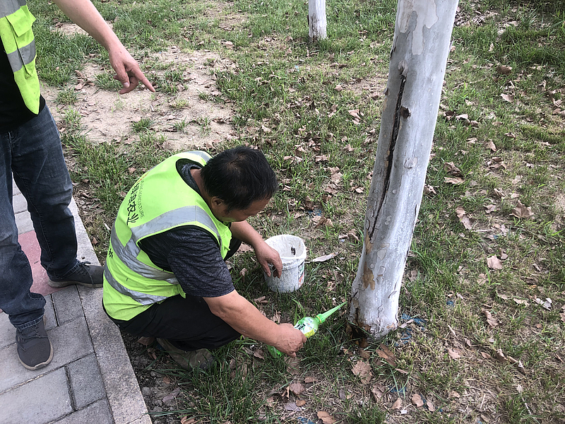 病蟲害防治。堅持“預防為主,防控結合”,持續做好夏季病蟲害防治,進一步加強樹木日常檢查力度,及時發現病蟲害端倪,對樹木、灌木、綠籬以及草坪進行混合藥物噴施,清除病蟲源,有效提升植物自身抵抗力,遏制病蟲害擴散,為灃西市民打造綠意盎然的人居環境。