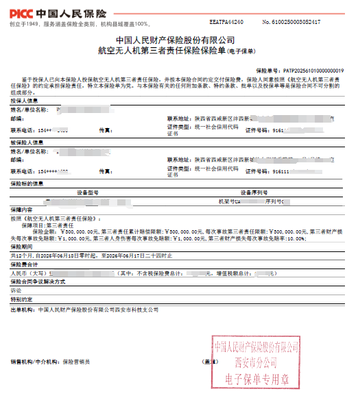 該保險為投保企業提供了30萬元的風險保障,主要針對無人機在試飛過程中可能對第三方造成的人身傷害和財產損失進行賠付,不僅幫助企業有效轉移潛在風險,也為周邊居民和單位的安全提供重要保障。