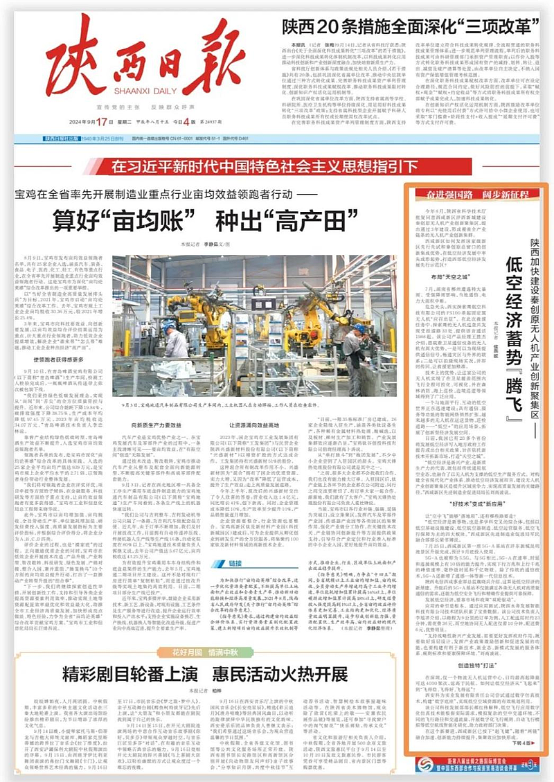 近日,陜西日?qǐng)?bào)頭版刊發(fā)《陜西加快建設(shè)秦創(chuàng)原無人機(jī)產(chǎn)業(yè)創(chuàng)新聚集區(qū)——低空經(jīng)濟(jì)蓄勢(shì)“騰飛”》,報(bào)道西咸新區(qū)作為秦創(chuàng)原總窗口在低空經(jīng)濟(jì)發(fā)展中率先成形起勢(shì),打造西部低空經(jīng)濟(jì)發(fā)展先行示范區(qū),為高質(zhì)量發(fā)展不斷注入強(qiáng)勁動(dòng)能。自2023年起,灃西科創(chuàng)搶抓低空經(jīng)濟(jì)新賽道,提前布局無人機(jī)產(chǎn)業(yè),在產(chǎn)業(yè)氛圍營(yíng)造、產(chǎn)學(xué)研合作、產(chǎn)業(yè)配套服務(wù)體系搭建等方面開展了一系列工作。