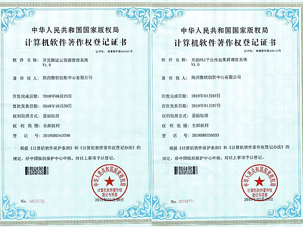 近日,由陜西微軟創(chuàng)新中心主導(dǎo)設(shè)計(jì)開(kāi)發(fā)的開(kāi)發(fā)測(cè)試云資源管理系統(tǒng)、開(kāi)放PAI平臺(tái)作業(yè)集群調(diào)度系統(tǒng)順利通過(guò)國(guó)家版權(quán)局審查,喜獲國(guó)家計(jì)算機(jī)軟件著作權(quán)證書。