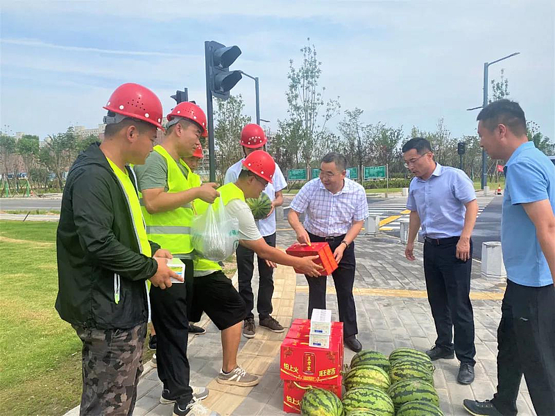 在項目現場,慰問組詳細詢問了工作人員工作生活,尤其是防暑降溫情況,了解了項目建設進度、疫情防控工作,要求相關單位務必做好防暑降溫、疫情防控和安全生產工作,合理安排作業時段,統籌做好項目建設各項工作,在確保項目建設人員安全健康的基礎上,高標準高質量完成各項建設任務。