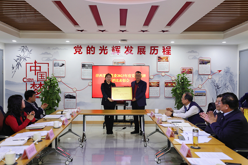 會上,郭廷喜宣讀了《關于表彰灃西集團2023年度黨建品牌評比獲獎單位的通報》,MIC黨支部、行政部黨支部、西咸信息產業園黨支部分別榮獲集團2023年度黨建品牌評比前三名。隨后,集團領導向獲獎單位頒發獎牌。