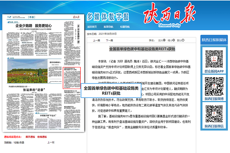本報訊 (記者 劉印 通訊員 魏濤)近日,銀河金匯——灃西綠色碳中和基礎設施資產支持專項計劃項目取得上交所無異議函,標志著全國首單綠色碳中和基礎設施類REITs正式獲批,這是西咸新區灃西新城創新綠色金融又一成果,為新區綠色發展再添新動力。