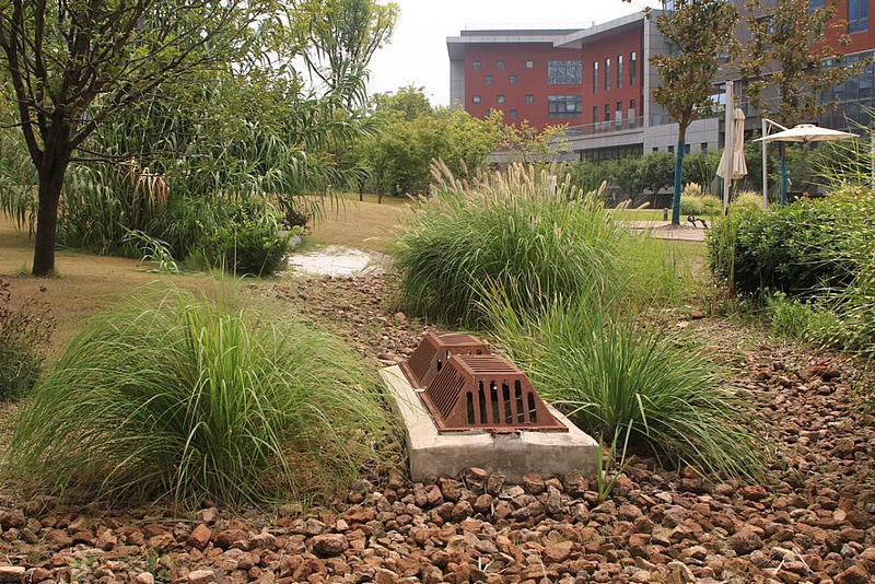 北方夏季雨水集中,如何避免城市短時積水問題?為此,魯偉根據(jù)儲排結(jié)合原則自創(chuàng)了一種低于路面的“雨水花園”。雨水花園相當于一個蓄水池,中間低兩邊高,城市雨水聚集在花園中形成一個天然的蓄水池。花園中的植物分散種植,建筑廢料則分散堆積在植物周圍,與土壤接觸的區(qū)域是中空的,水流可以滲到地下,防止地表出現(xiàn)積水。若雨水達到一定極限,則通過地下溝渠或過濾透水層分流入景區(qū)人造湖泊或河流,從而杜絕雨水溢滿現(xiàn)象。